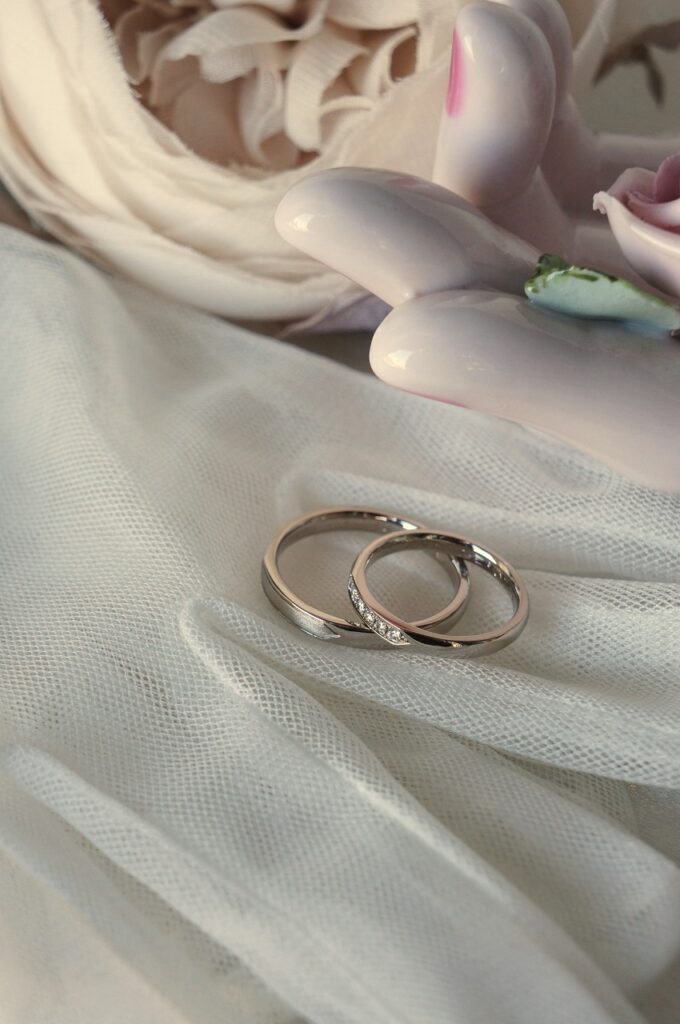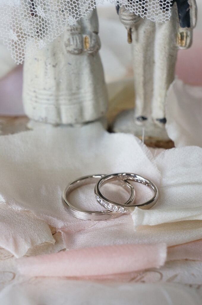 お選びいただける素材はアンティーク調の白みの18金ホワイトゴールドでお揃いに。